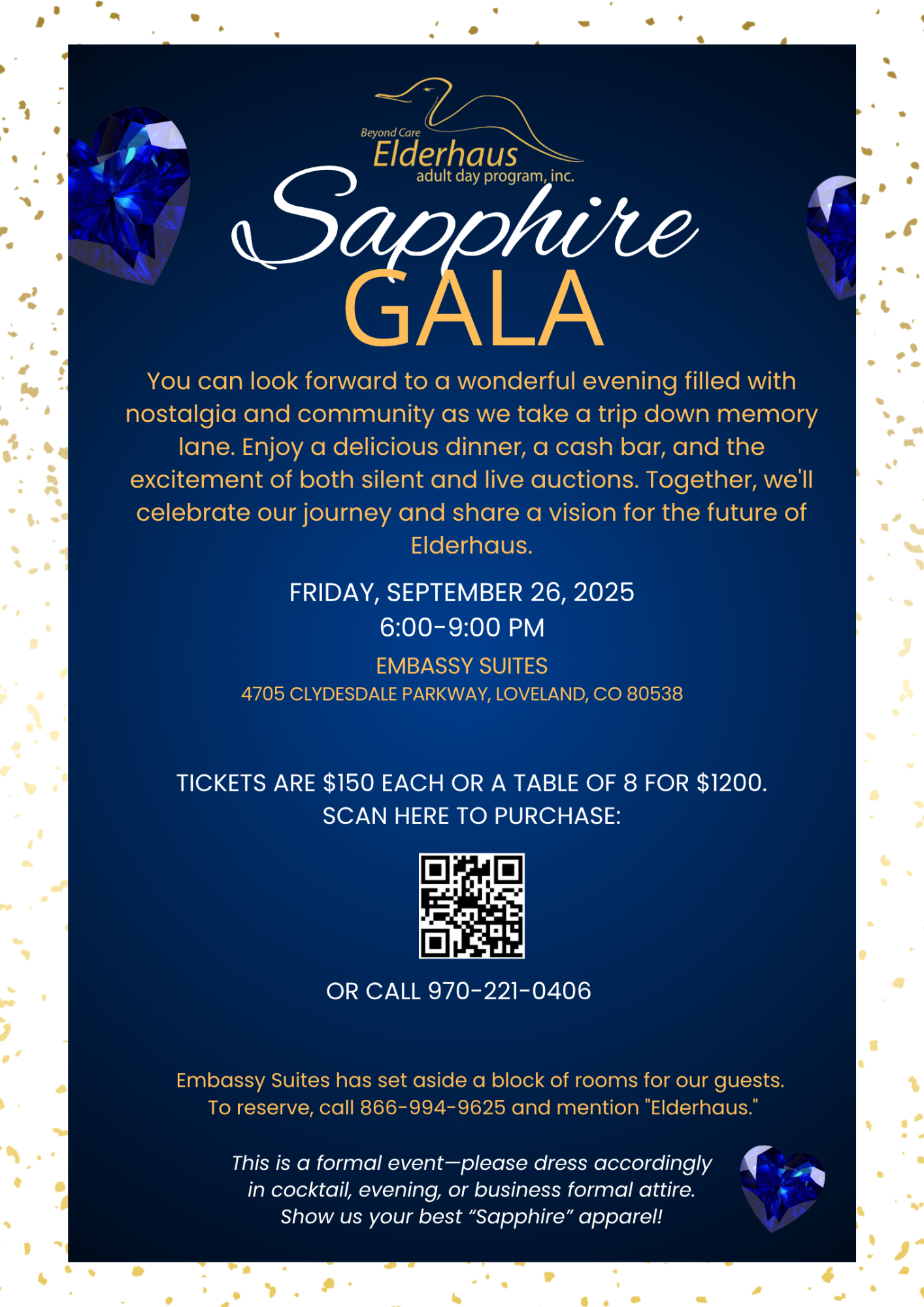 Sapphire Gala, is an evening of celebration of 45 years of service, community, and purpose. The event will raise essential funds to support Elderhaus’s mission of providing meaningful, life-enriching services for adults living with dementia and intellectual or physical disabilities and respite for their caregivers.