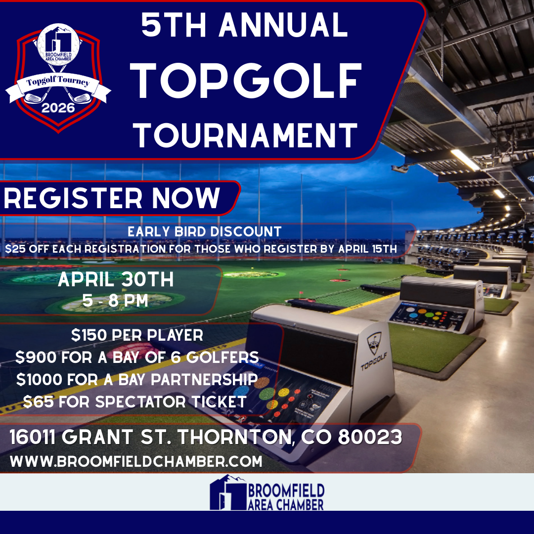 5th Annual Topgolf Tournament! The Broomfield Area Chamber is excited to host our 5th Annual Golf Tournament at Topgolf Thornton, a fun and easy-to-play event for golfers of all skill levels. Topgolf’s unique scoring system makes it perfect for both experienced players and beginners, and each ticket includes three hours of play, tournament scoring, a […]